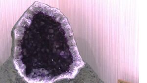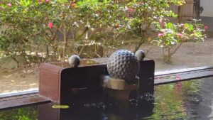 館内には、ゴルフボールの形をした石から温泉が流れ出ていたり、脱衣所に大きな天然石(アメジスト)の置物が飾られていたりと、細部にも遊び心が。訪れるたびに新しい発見があります。